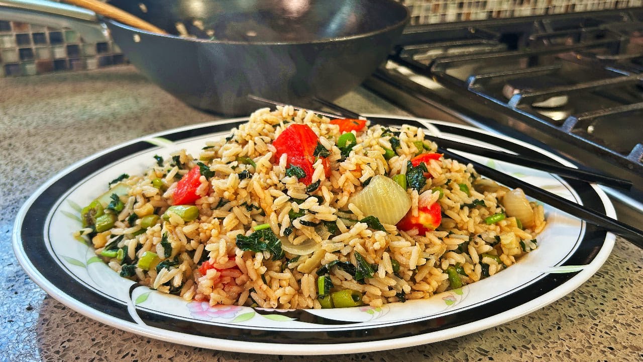 Every summer when my garden is overflowing with fresh produce, I find myself creating quick, healthy, and satisfying dishes that highlight the season’s best flavors. One of my favorites is this vegan fried rice with Jamaican callaloo (aka chorai bhagi or spinach) and garden vegetables. Fried rice has long been a staple in many Caribbean households, and while it often takes on bold colors and rich flavors from sauces, this version is a lighter take that allows the natural taste of the vegetables to shine.