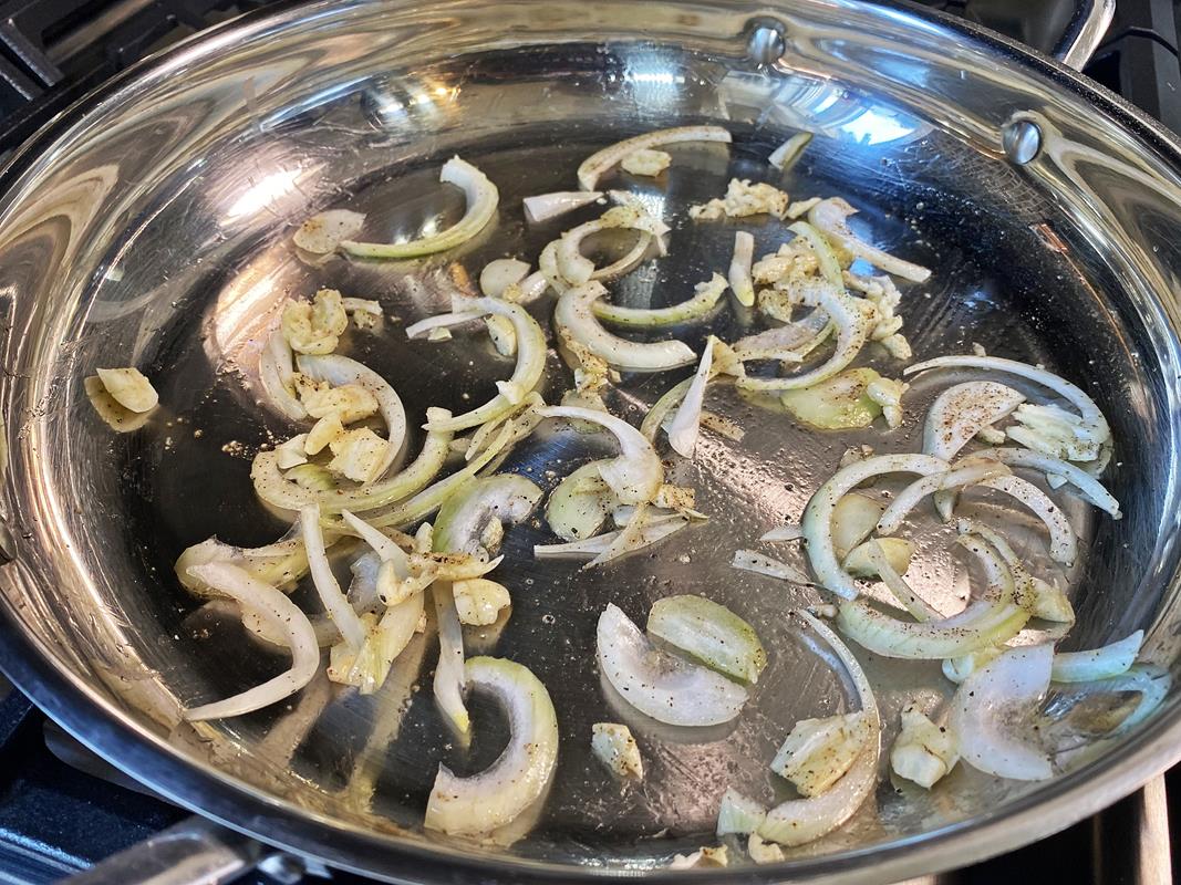 Heat the oil in a wide pan on a medium heat, then add the onion and garlic. Turn the heat down to low and cook gently for 3-4 minutes.