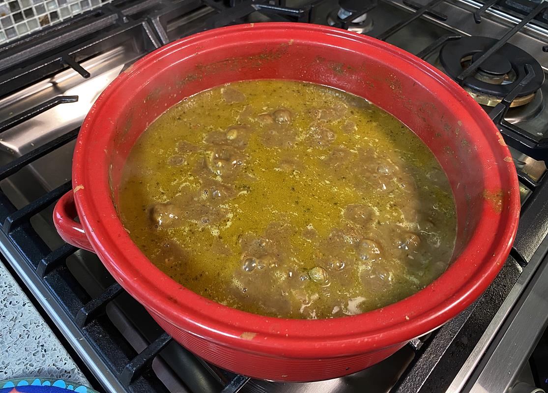 You’ll need to have some patience moving forward now as we want both the beef and peas tender. I mean falling apart with the use of our fork. This means we’ll bring it to a boil then reduce the heat to a rolling boil/simmer and cook anywhere from 2 hours to 2.5 hours.