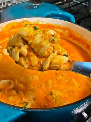 It’s time to add the seasoned pieces of Cod fish to the saucepan and being very gentle, stir to make sure the pieces are all coated with the rich coconut tomato sauce.